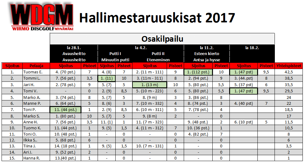 Hallimestaruus ratkaistiin neljänä lauantain käydyissä kisoissa, joissa piti hallita niin avausheitto, puttaaminen kuin lähestyminenkin eri vinkkeleistä. Tuomas teki tasaisinta jälkeä ja nostaen pikkuhiljaa tasoaan ja vieden kaksi viimeistä osakilpailua omiin nimiinsä ja näin myös hallimestarin tittelin itselleen kaudeksi 2017.